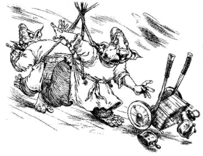 In Freeglader, Heeb and Rumpel, two low-belly goblins, are described to be walking through "thick, claggy mud that clung to their tattered boots." However, an illustration further down the same page depicts them without any boots at all.