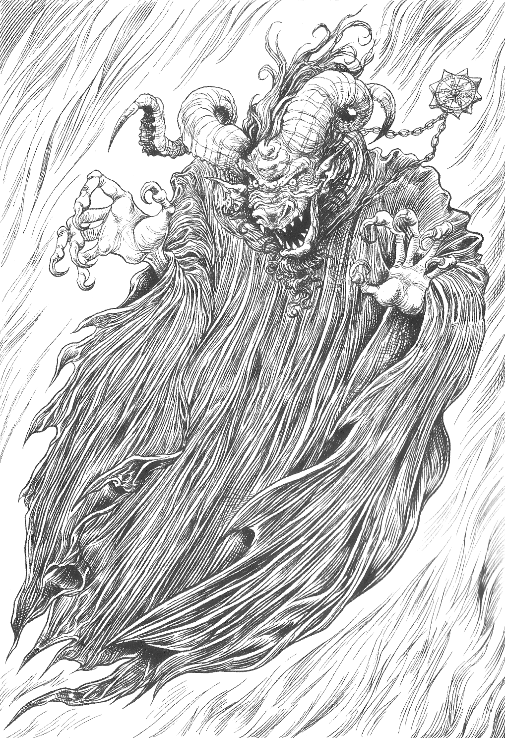 As a shapeshifter, the Gloamglozer could resemble any living creature, but its true form was a hideous creature with a warty, sneering face, framed by two sinister curving horns, cloaked in a featureless robe that floated above the ground, with long arms and calloused hands ending in sharp claws which hold a plain wooden staff with a skull mounted on it. The Gloamglozer was said to feed on others' emotions, and, like glisters, it craved fear above all other emotions. It could not cause harm directly, since it possessed no physical strength, but it used a combination of lies, trickery and traps to lead victims to death.