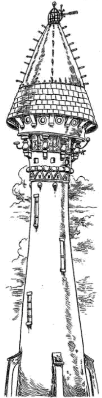 The Loftus Observatory was the tallest tower in Sanctaphrax. At the very top of the tower was a giant telescope for observing the skies. This telescope could see far out into open sky, and long distances over the Deepwoods, since it was situated at the highest point in the Edge, apart from Riverrise. Below the telescope was a room filled with equipment representing every academic discipline in the floating city, even minor institutes such as the Department of Psycho-Climatic Studies.