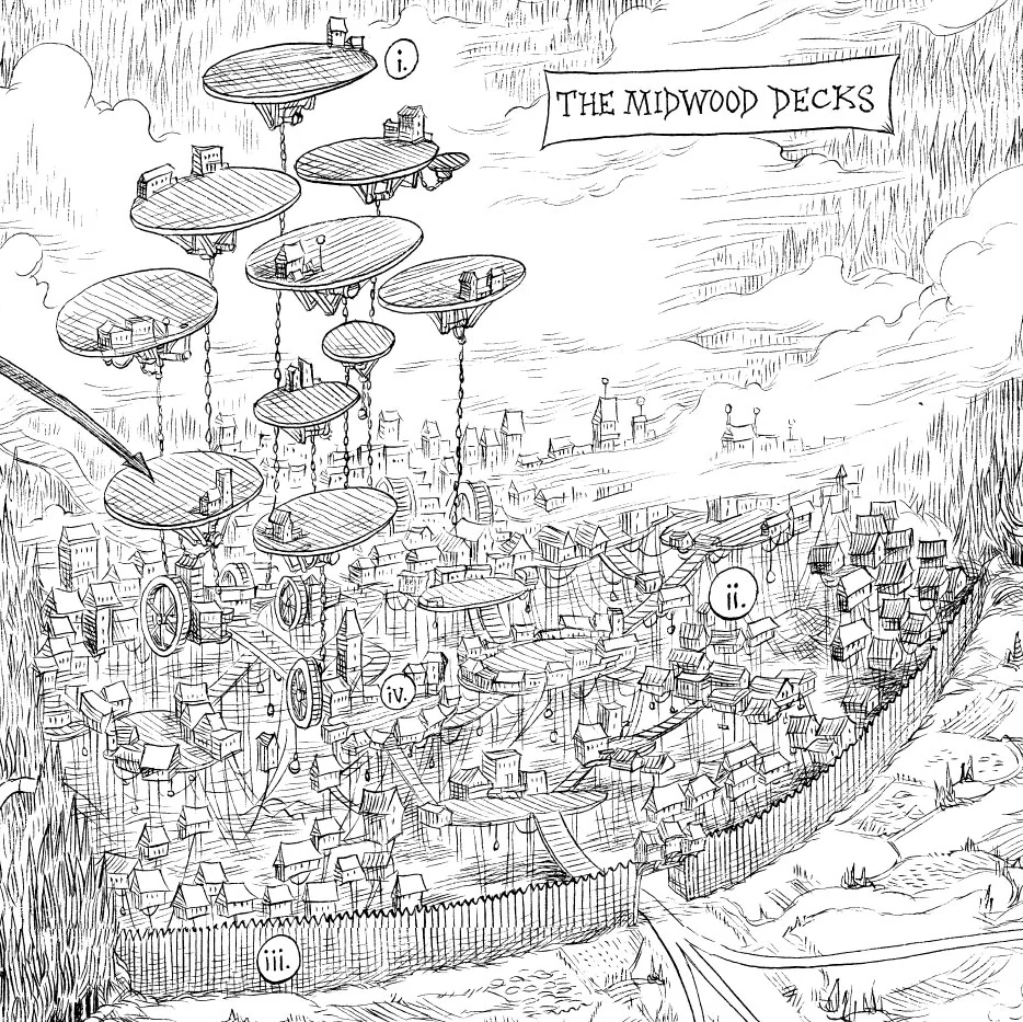 The Midwood Decks was a lawless city. Hired thugs kept watch at the gate. Political disagreements between the free timbersmiths and the pro-Hivers resulted in casual, public murder on the walkways. No higher authority stepped in to stop the violence and the bodies were simply thrown onto the ground below to be eaten by hammelbills.