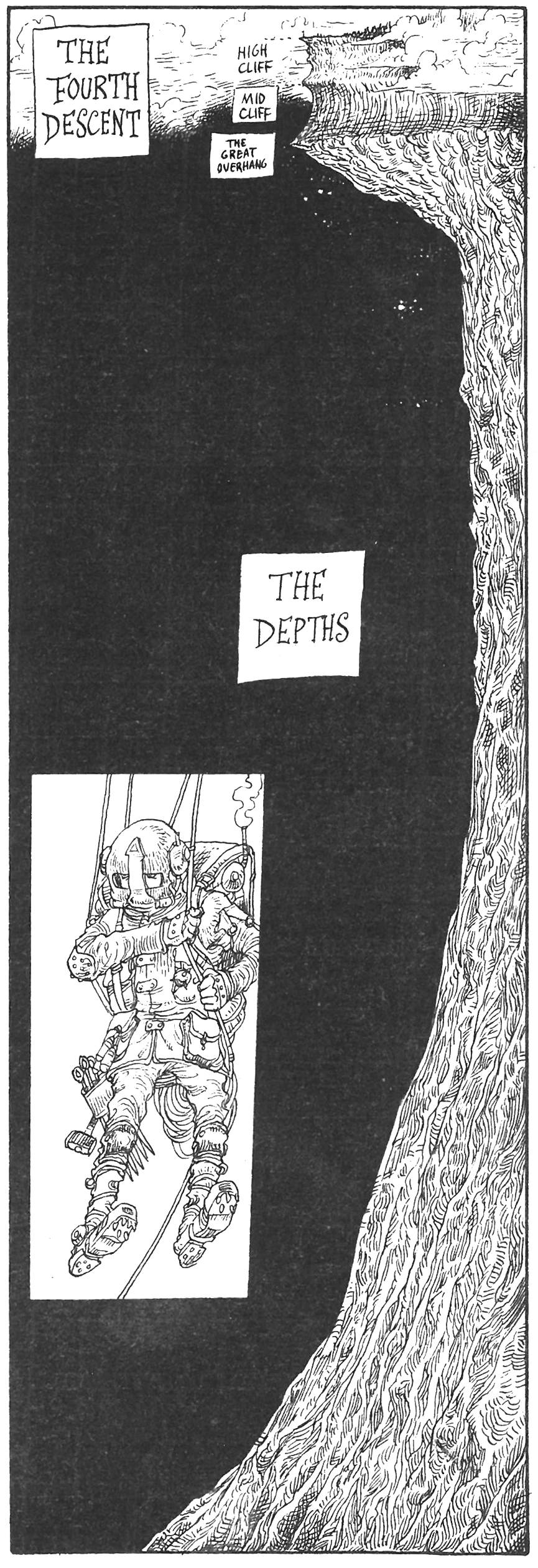 Tthe first few days consisted of many long drops which took about a day to complete. During these drops, glisters caused delusions, though the descenders were protected by sleep-hoods. Nate's vent became loose in his sleep-hood, causing his mind to become taken to the descenders who had died on previous descents, however Ambris realised before this became fatal. The descenders managed the Cusp without much difficulty.