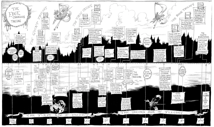 This page is a timeline of the major events of the Edge Chronicles. For the purpose of this page, Edge Years (ᴇ.ʏ.) will be used, however, it was never shown whether the inhabitants of the Edgeworld actually used this system. Edge Years are counted from the birth of Quintinius Verginix, so 1 ᴇ.ʏ. is the first year after Quint's birth.